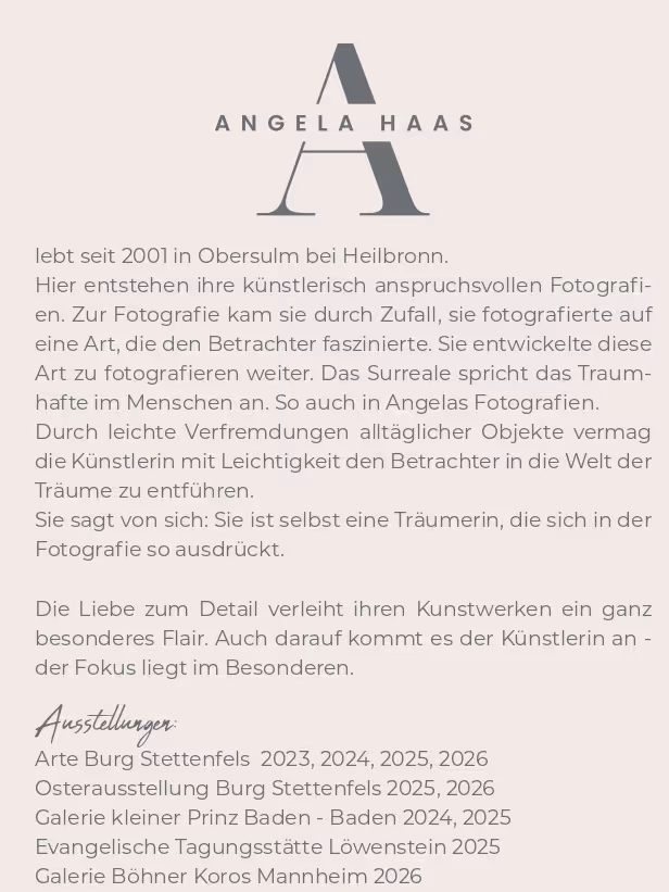 Hier werde ich Sie künftig über „Dies und Das“ informieren, einschließlich Rabatte und Aktionen. Es werden kontinuierlich Fotos ausgetauscht und hinzugefügt, seien Sie gespannt. Alle Aufnahmen sind made by me und einzigartig. Ich freue mich auf Sie.
